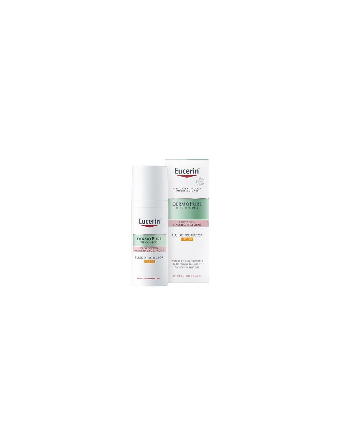En Farmacia Espejo te presentamos el Eucerin DermoPure Oil Control Fluido Protector SPF 30 (50 ml, C.N. 203831), recomendado para pieles con tendencia acnéica o que presentan marcas post-acné. Su fórmula combina filtros UVB/UVA SPF 30 con ingredientes activos como decanediol (antibacteriano), licocalcón A (calmante) y una tecnología seborreguladora para un acabado mate duradero. Clínicamente probado para proteger, mejorar y matificar la piel.