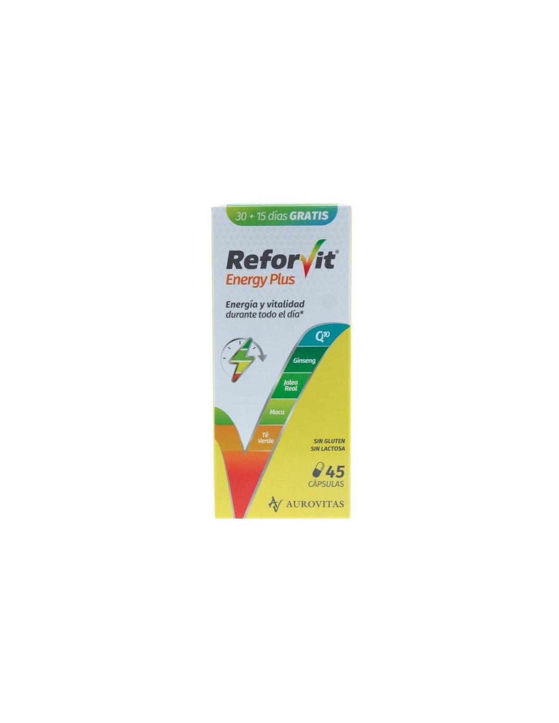 ReforVit Energy Plus 45 cápsulas es un complemento alimenticio con coenzima Q10, ginseng, jalea real, maca y té verde, formulado para aumentar la energía, reducir la fatiga y mejorar el rendimiento físico y mental.