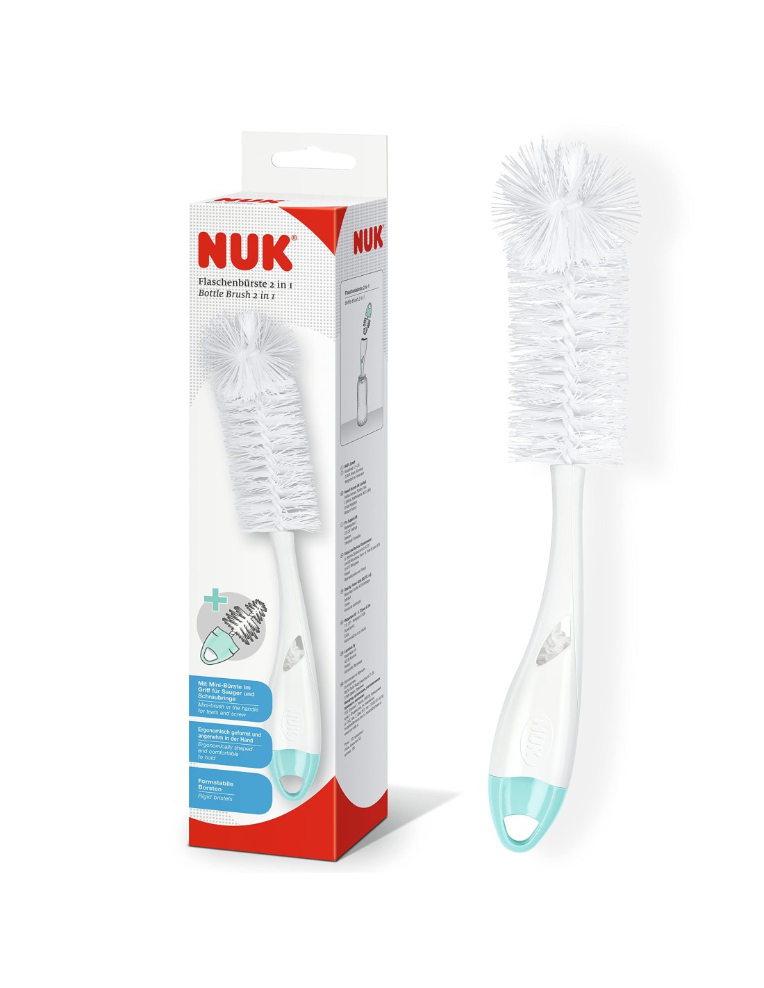 El Cepillo Limpiabiberón NUK Set 2 en 1 es un accesorio esencial para la higiene de los biberones y tetinas de tu bebé. Su diseño ergonómico y cerdas suaves permiten una limpieza profunda y efectiva, asegurando que cada rincón quede libre de residuos, manteniendo la salud y el bienestar de tu pequeño.