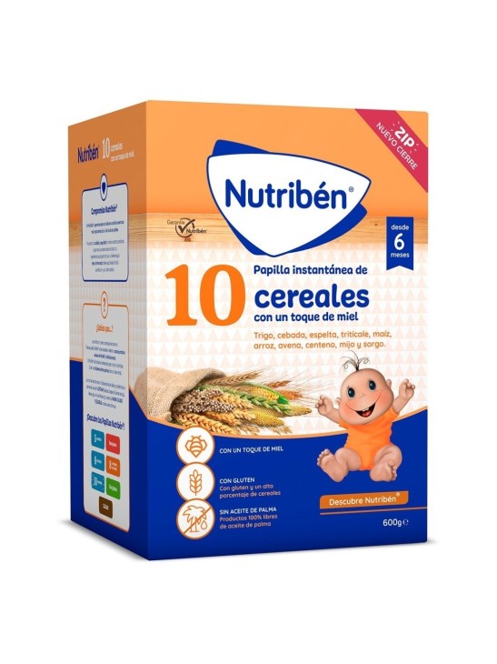 Nutriben 10 Cereales Miel es un alimento para la alimentación infantil que combina 10 cereales diferentes con un toque de miel, proporcionando una nutrición equilibrada y deliciosa para los más pequeños. Su fórmula rica en fibra y nutrientes esenciales apoya el crecimiento saludable y el desarrollo adecuado de los niños.