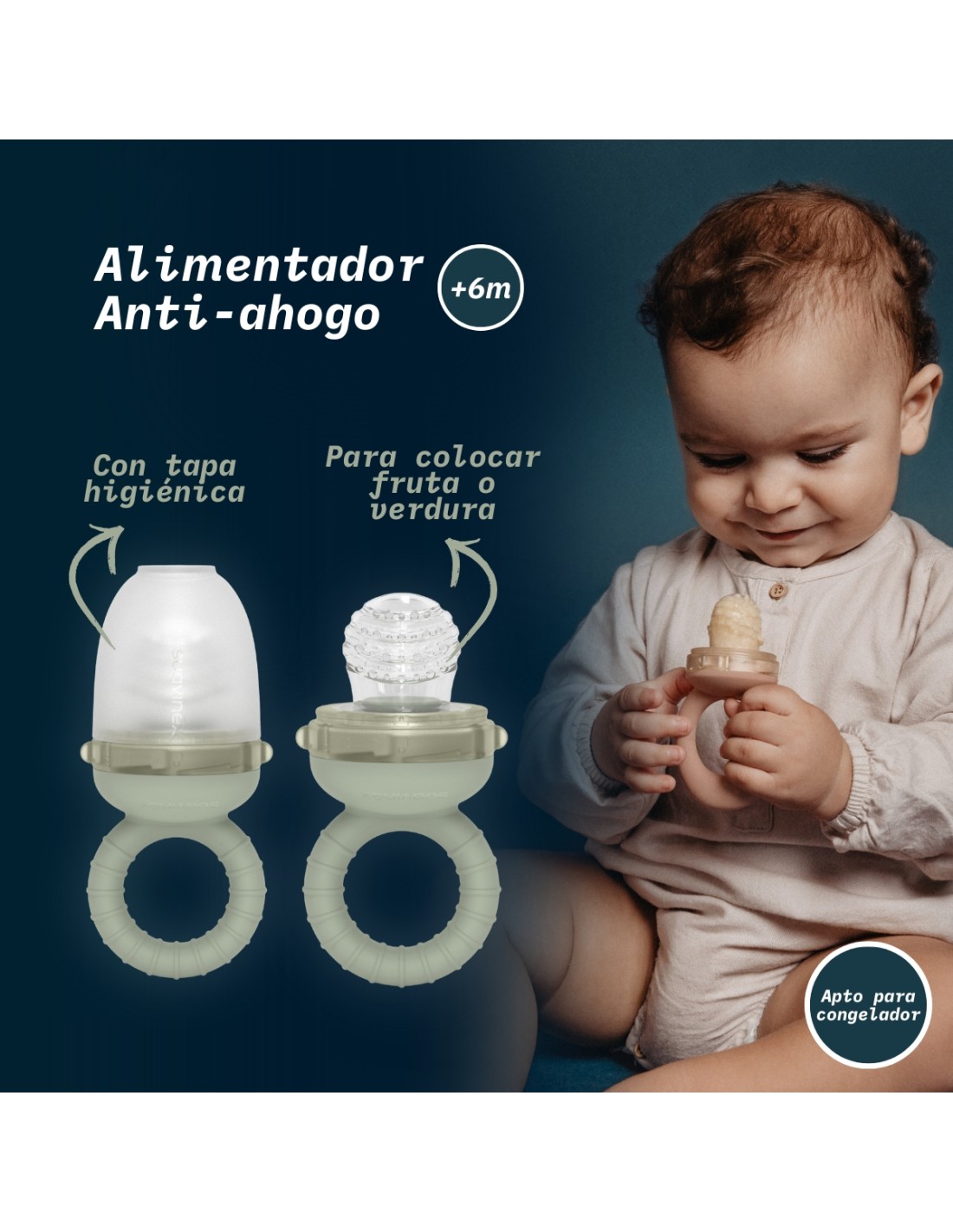 - Apto para refrigerador y congelador: ideal para frutas o compotas frías que alivian las encías.