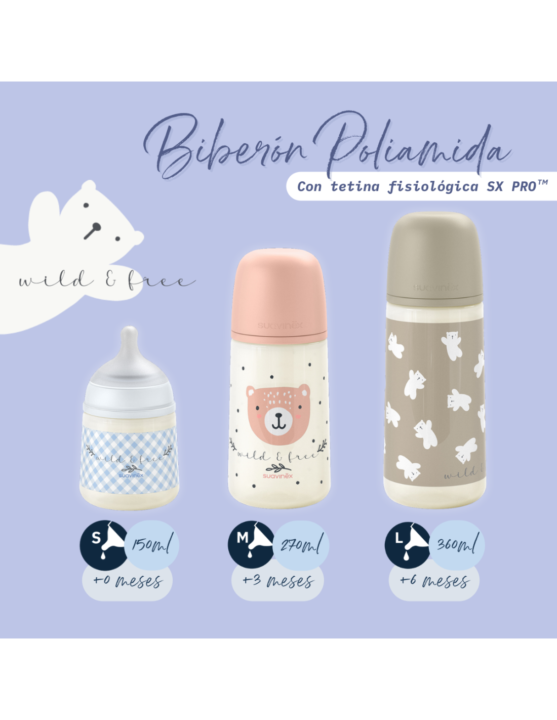 Formato: 1 biberón de 360 ml con tetina de silicona fisiológica flujo L.