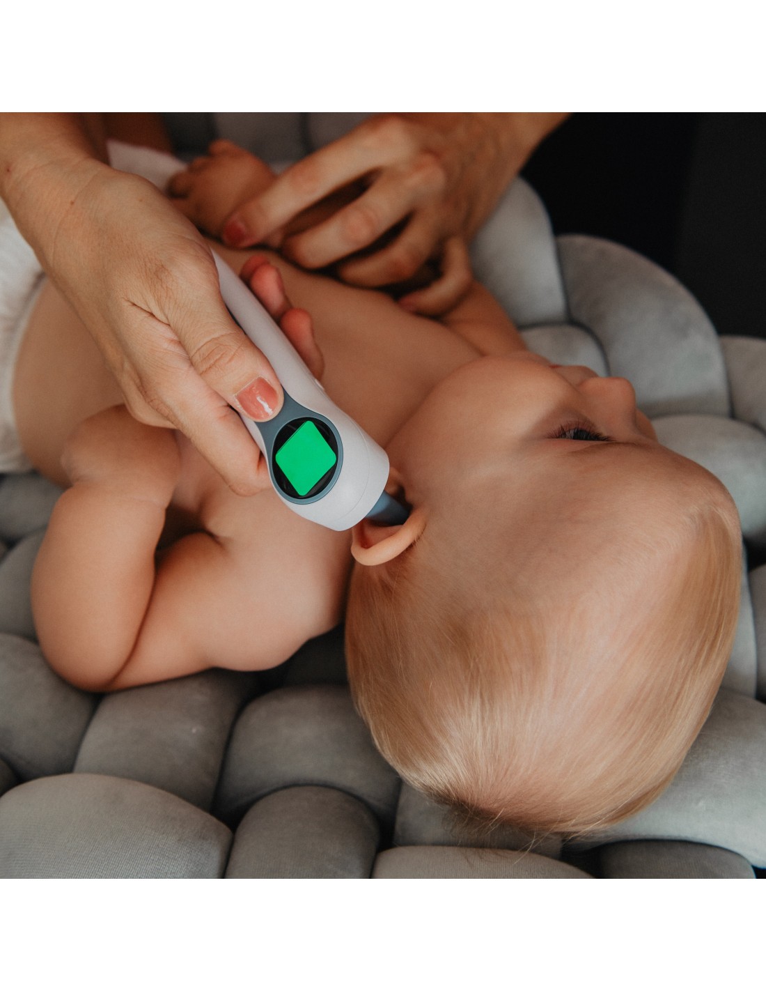 Termómetro digital de infrarrojos sin contacto que mide la temperatura de forma rápida, precisa e higiénica en bebés, niños y adultos.